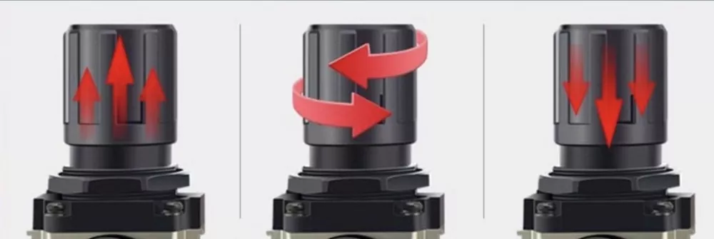 調整キャップには圧力目盛りが付いています。エアを供給する場合はノブを引き上げ、時計方向に「+」方向に回すと圧力が増加します。調整後はノブを押し下げてロックします。