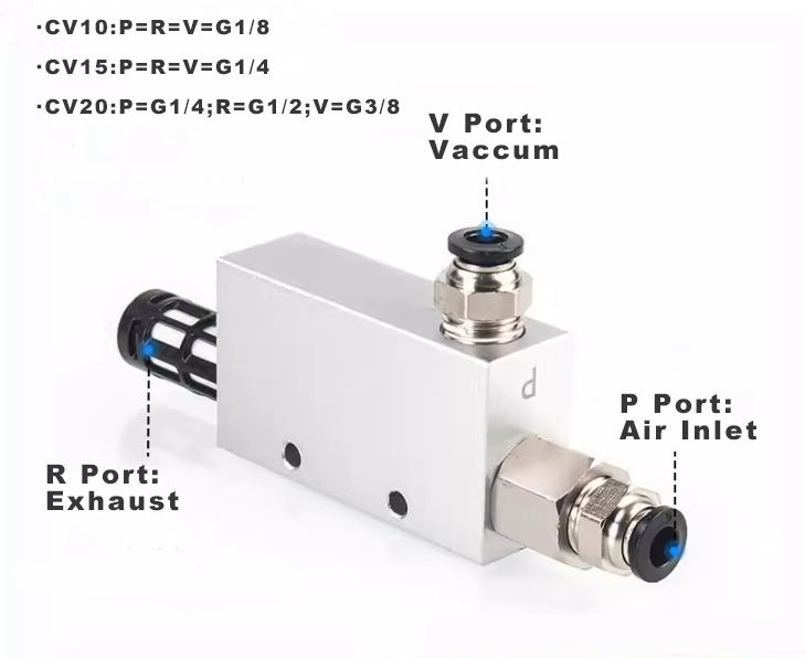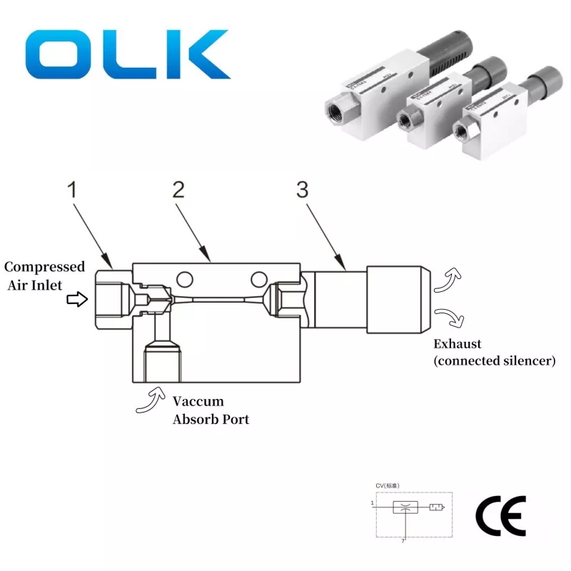 Ouleikai (OLK) CV 真空発生器は、吸引ノズルや治具に必要な真空環境を提供するために使用されます。吸気ポートは圧縮空気に接続し、吸盤は真空ポートに接続する必要があります。圧縮空気が吸気ポートから排気ポートに流れると、真空ポートに真空が発生します。この真空力を利用して物体を接着し、固定や支持などの作業を実現できるため、工業生産の作業効率が向上します。
