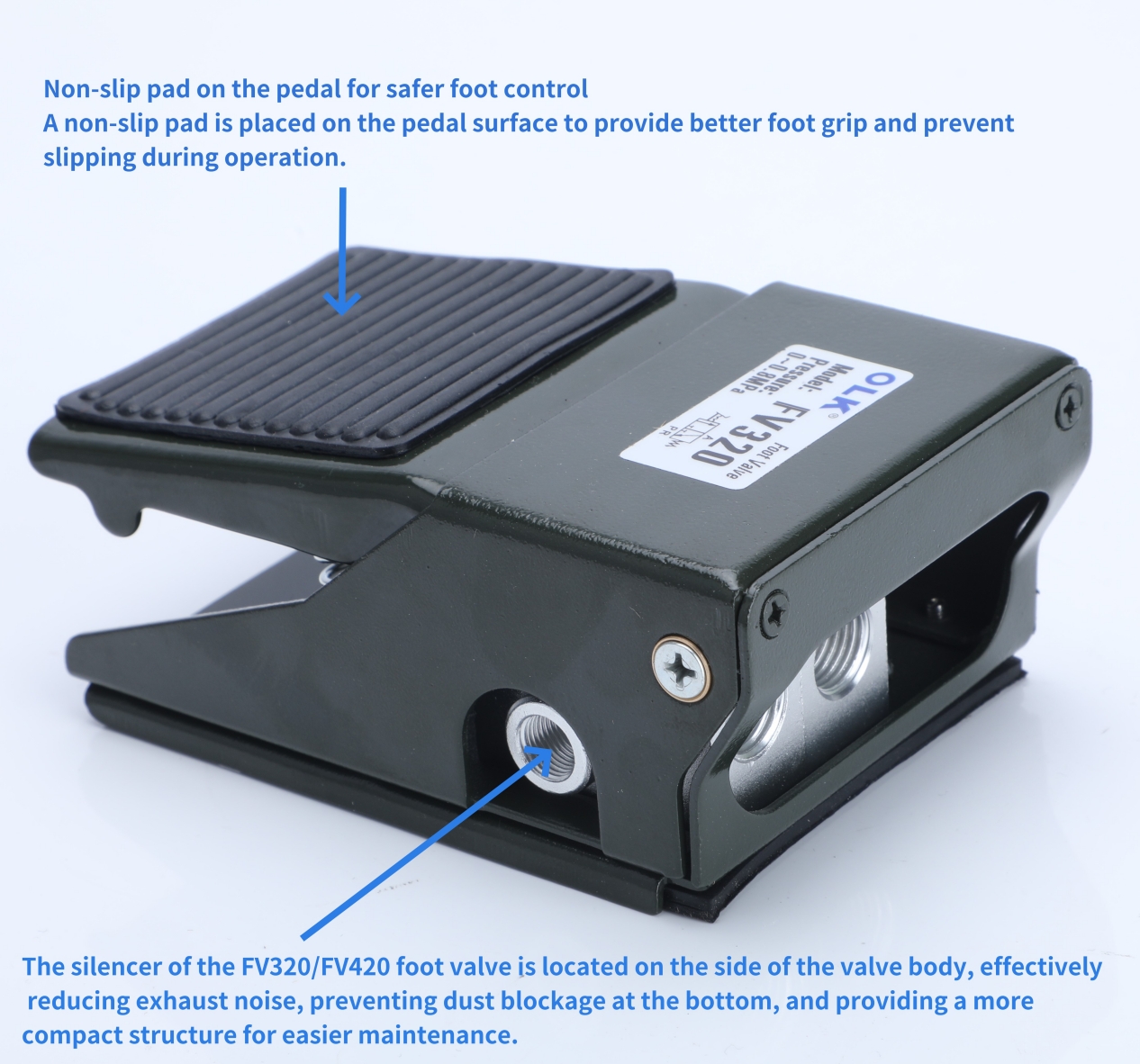 OLK 中国の空気圧メーカー良い FV320/420 シリーズ フット バルブ 3 ウェイ 4 ウェイ。 FV320/420フットペダルバルブはシングルアクションタイプです。固着やエア漏れがなくスムーズな踏み心地が特徴です。変形しにくく、耐食性、耐摩耗性に優れています。