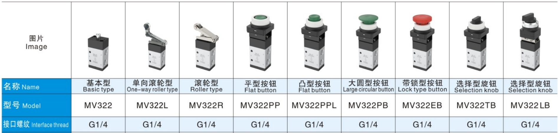 MV522 メカニカル バルブは 2 ポジション 5 ウェイ、MV322 メカニカル バルブは 2 ポジション 3 ウェイです。